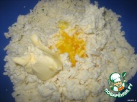 - Тем временем делаем начинку. Любой рассольный сыр (брынза, сулугуни, адыгейский) натираем на крупной терке. На каждые 400гр добавляем 1 ст.л. сливочного масла и 1 сырой желток.