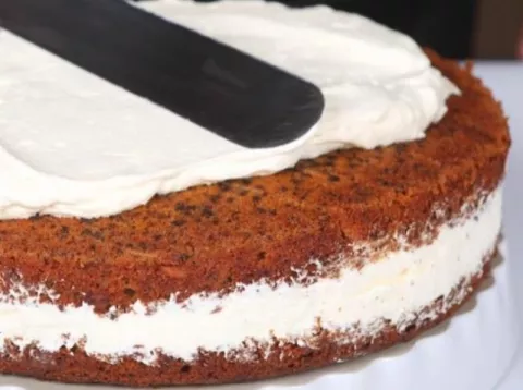 - Во взбитые яйца добавтье мучную смесь, перемешайте. Затем добавьте тертую морковь и рубленные орехи. Выложите тесто в подготовленную форму. Поставьте форму разогретую до 180 градусов духовку и готовьте 30-40 минут. Проверить готовность бисквита можно, вставив забочистку в центр. Она должна быть сухая.