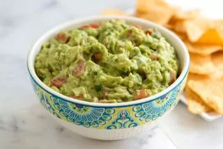 Serve immediately or cover with plastic wrap by pushing the plastic wrap down onto the guacamole and refrigerate up to one day.